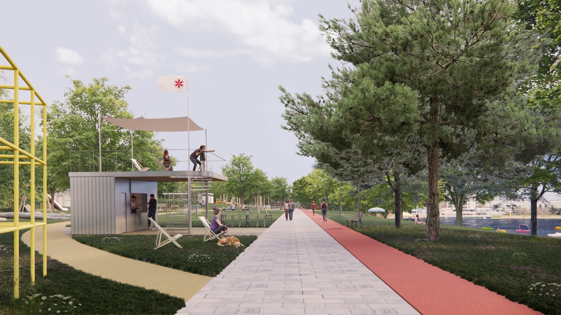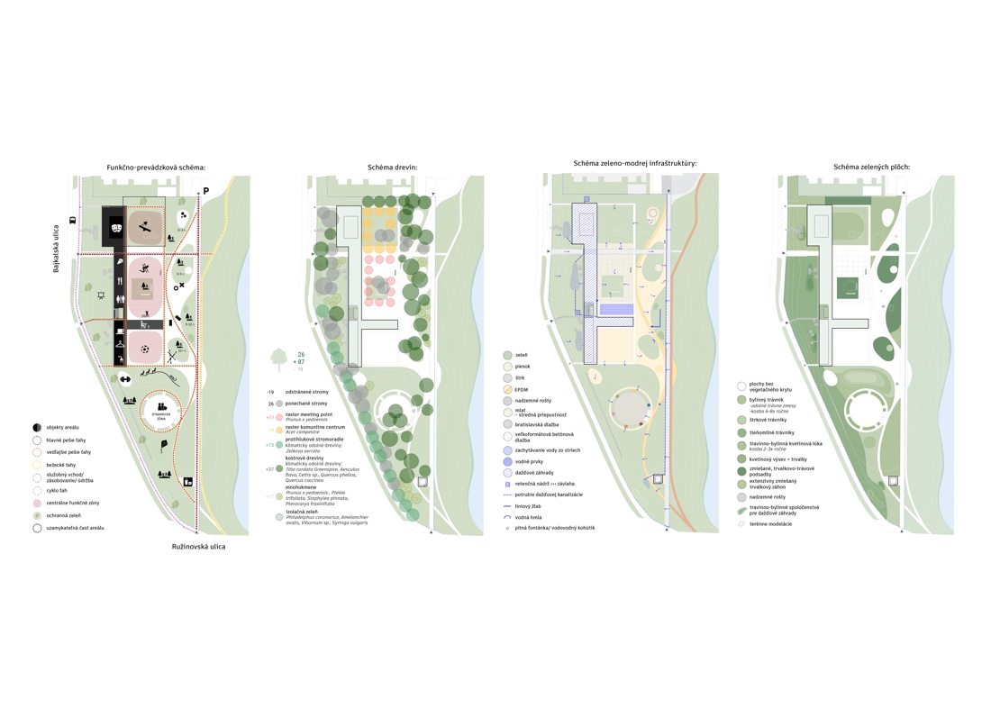 Navrhovaný urbanizmus a návrh zelene vytvárajú hlukovú bariéru od rušnej Bajkalskej a Ružinovskej ulice ktorá definuje jasný priestorový rámec pre koncentráciu aktivít. Areál tvoria tri hlavné zóny s osobitým charakterom: mäkký park, centrálne priestranstvo a zóna hier. Všetky zóny sú spoločne prepojené a každá je orientovaná k hlavnému miestotvornému prvku – Štrkoveckému jazeru.